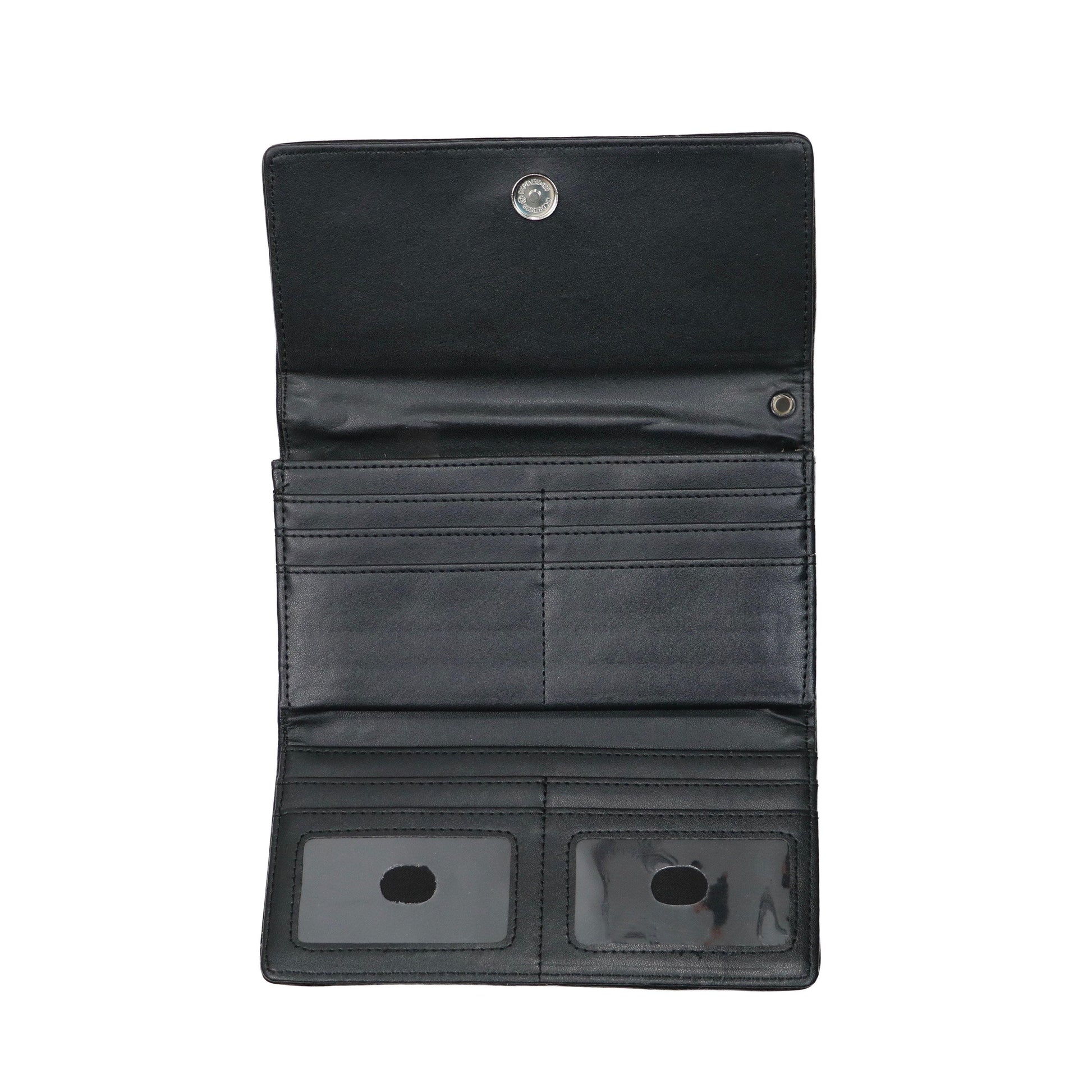 - Interior features 8 credit card slots, 2 ID holders with windows, 3 bill compartments, and a zippered pocket