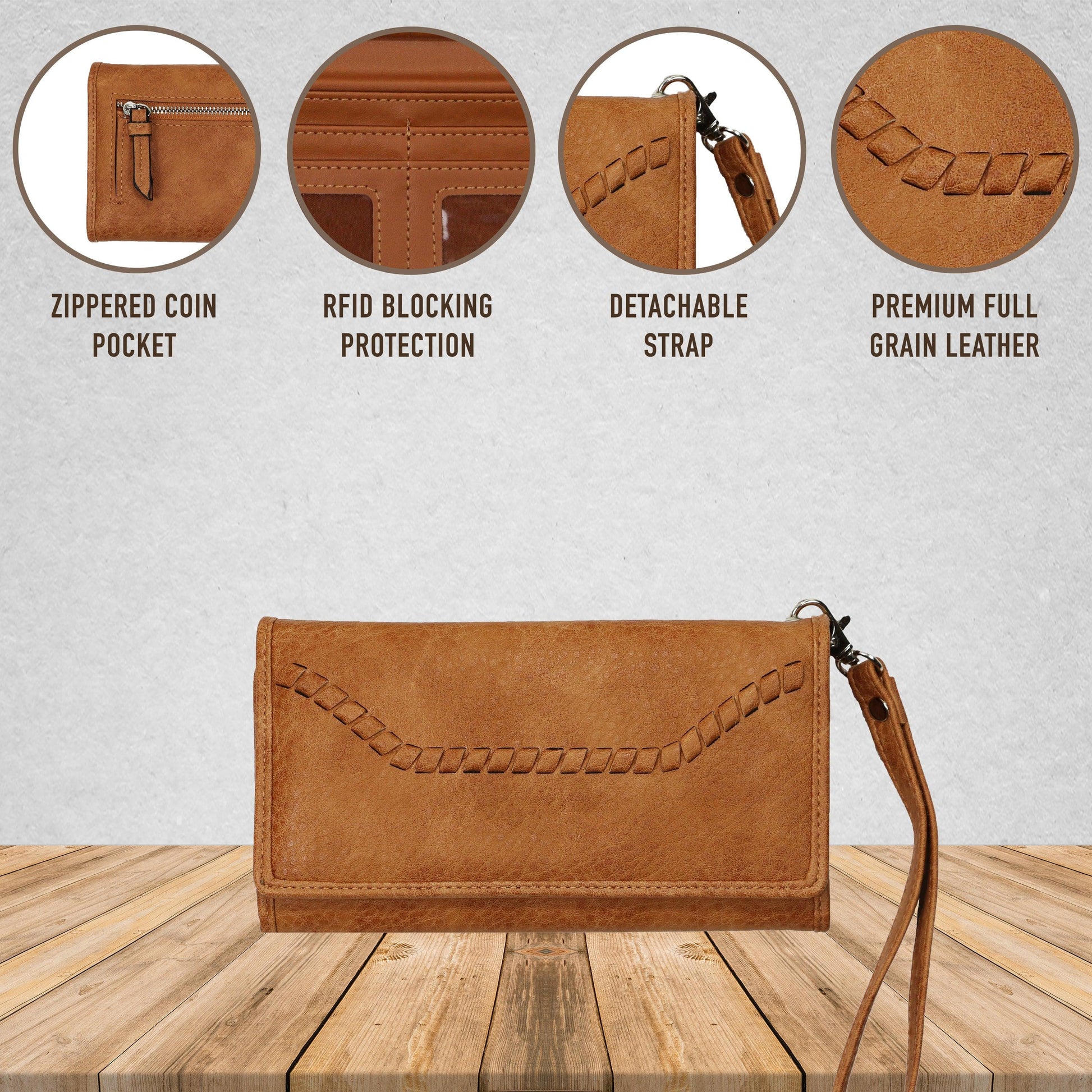 - Zippered coin pocket on back