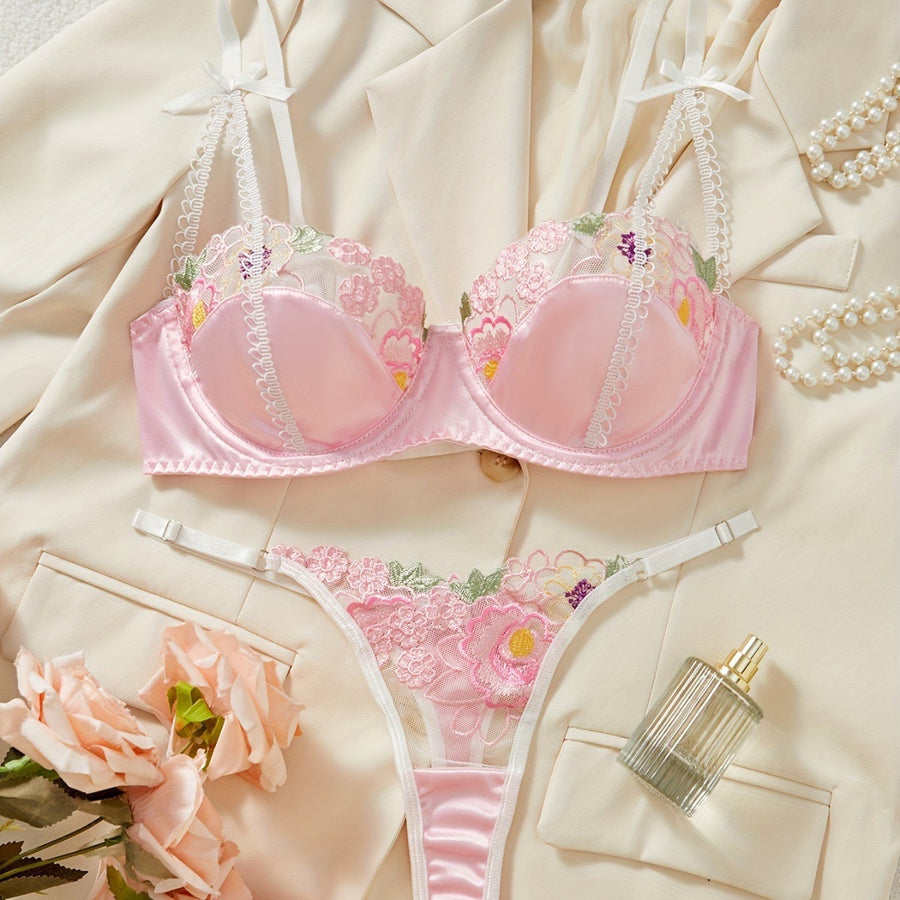 Sexy non-stretch stitching flower embroidery meh with underwire two-piece set