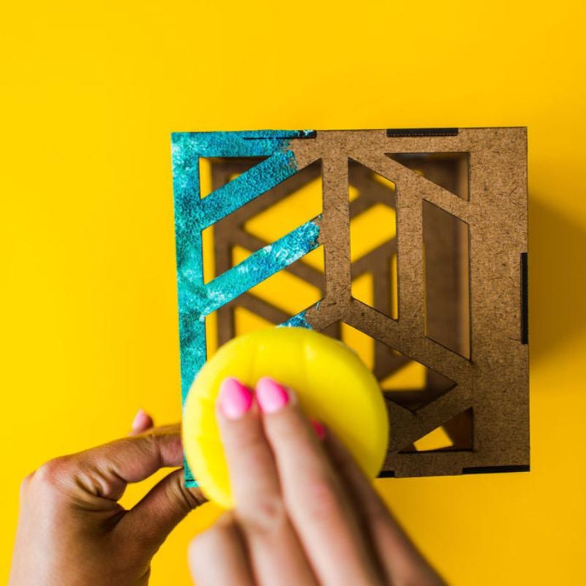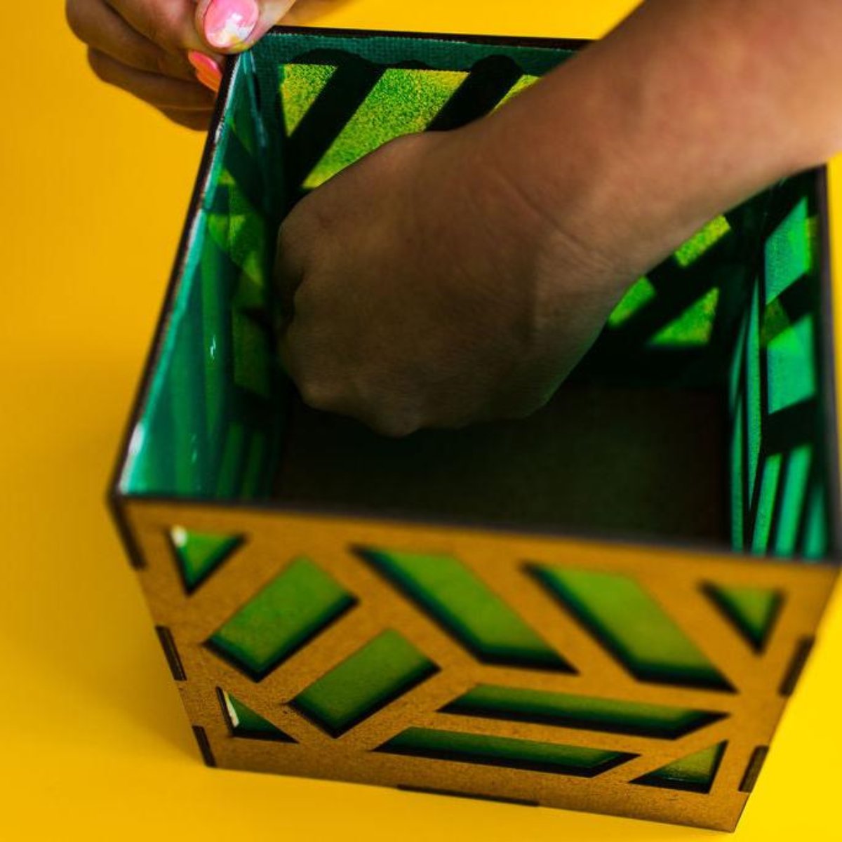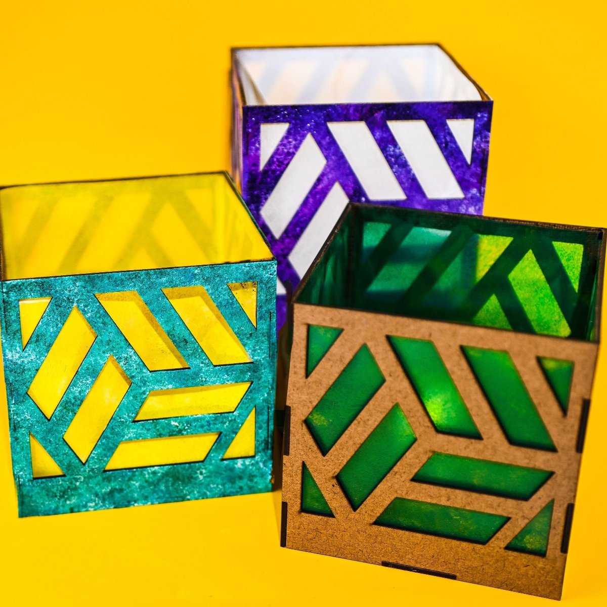 This craft kit includes 16 paint colors, acetate paper, a sponge, and an LED tea candle. The ready-to-build shadow box can be customized in countless ways! Crafters will need scissors.