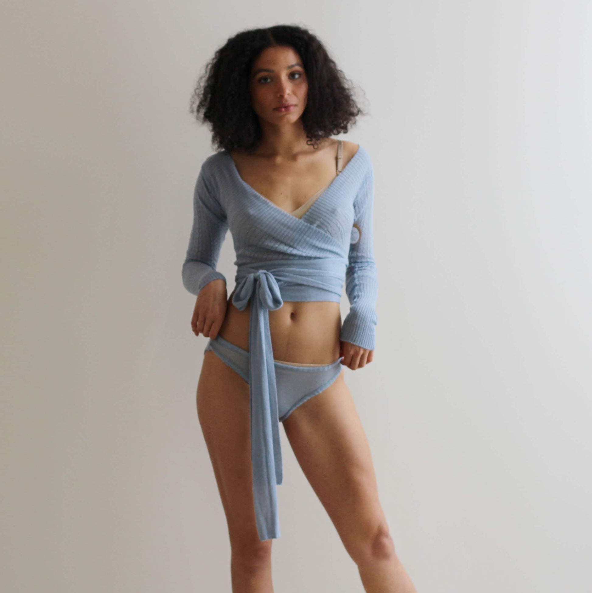 A cropped shrug with wrap around belts in pointelle knit made of silk and cashmere yarn