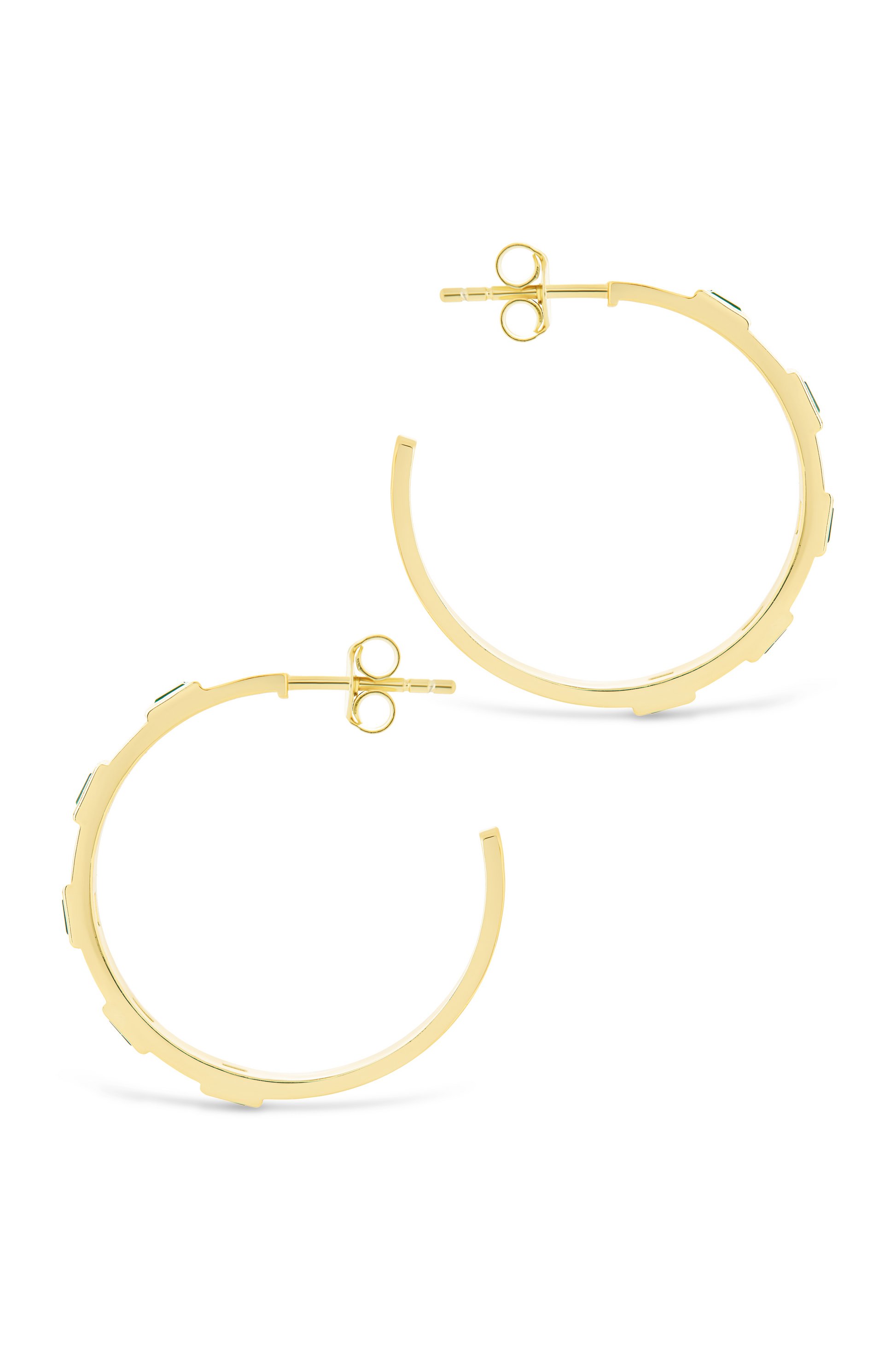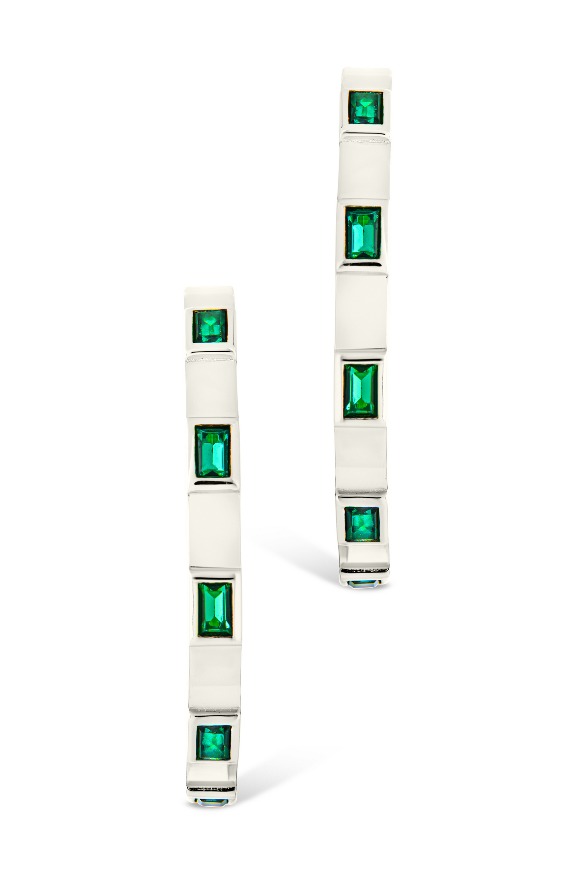 Features: 1" hoop, 2.9mm wide, 1.5mm raised bezel set emerald cz stones, post back, lead and nickel free