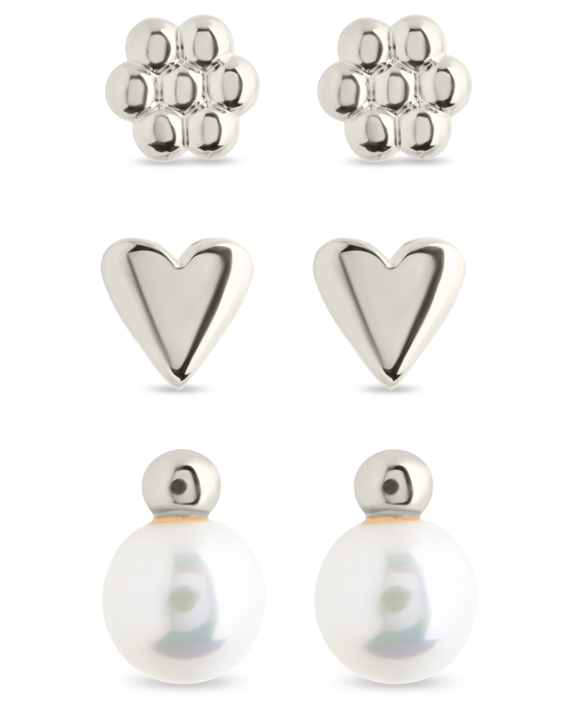 Sterling Silver Irene Pearl, Flower, & Heart Stud Earring Set of 3