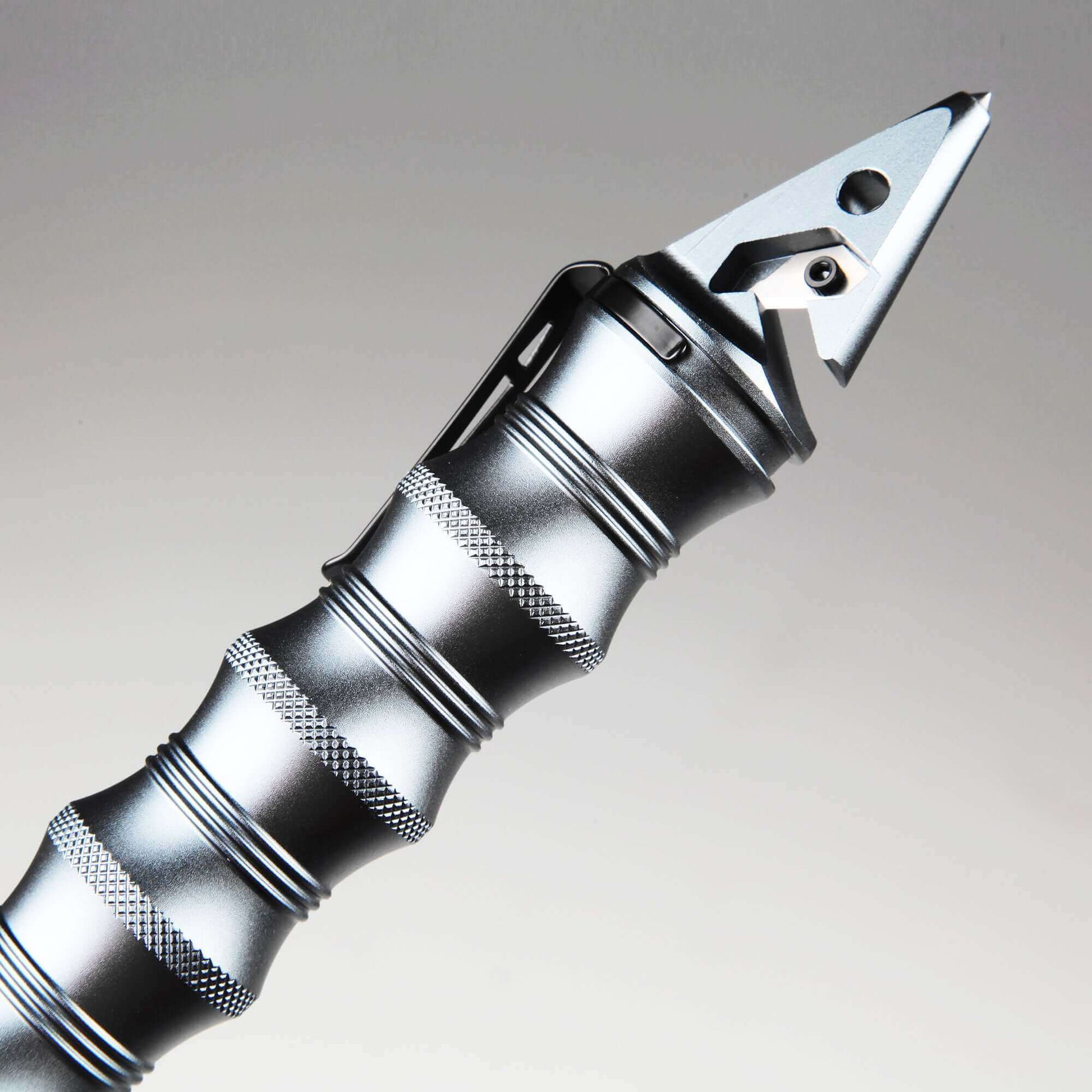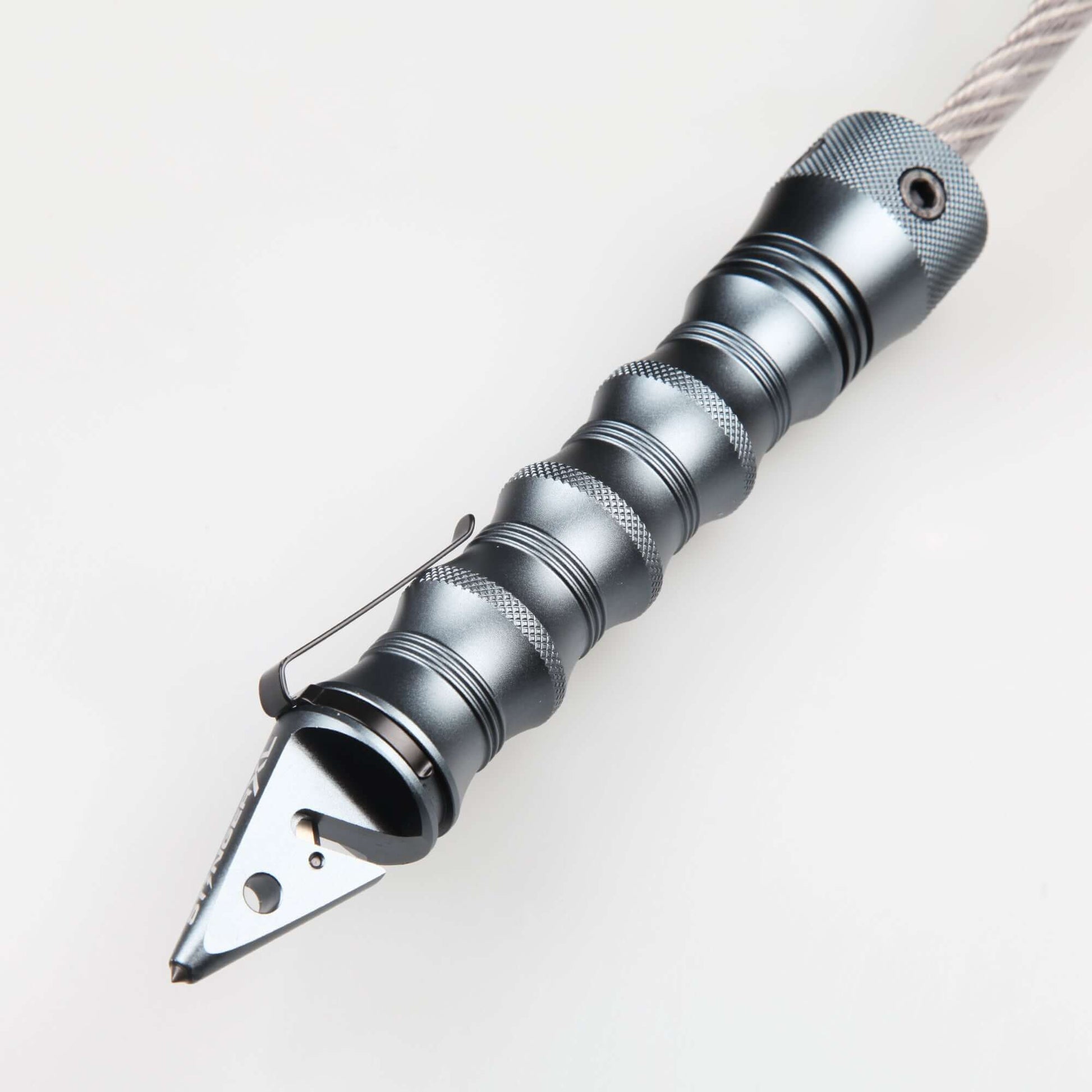 - The hardened steel tip on the handle is a window breaker designed to shatter tempered glass if a vehicle is entrapped.