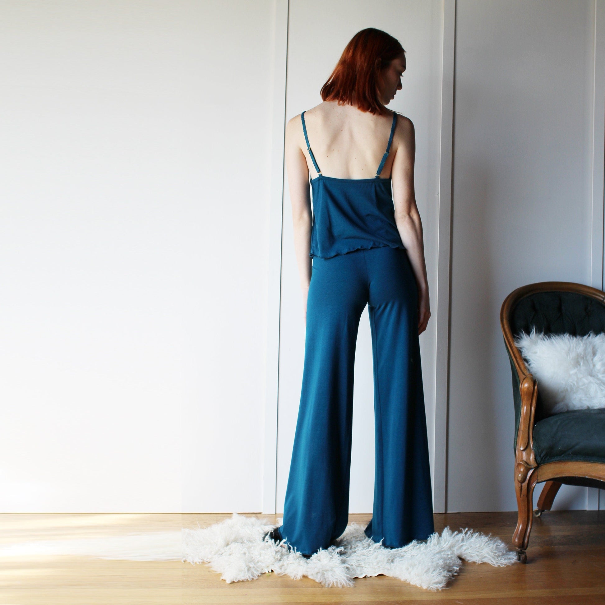 2 Piece Pajama Loungewear Set with the wide leg foldover lounge pant and the drape neck camisole