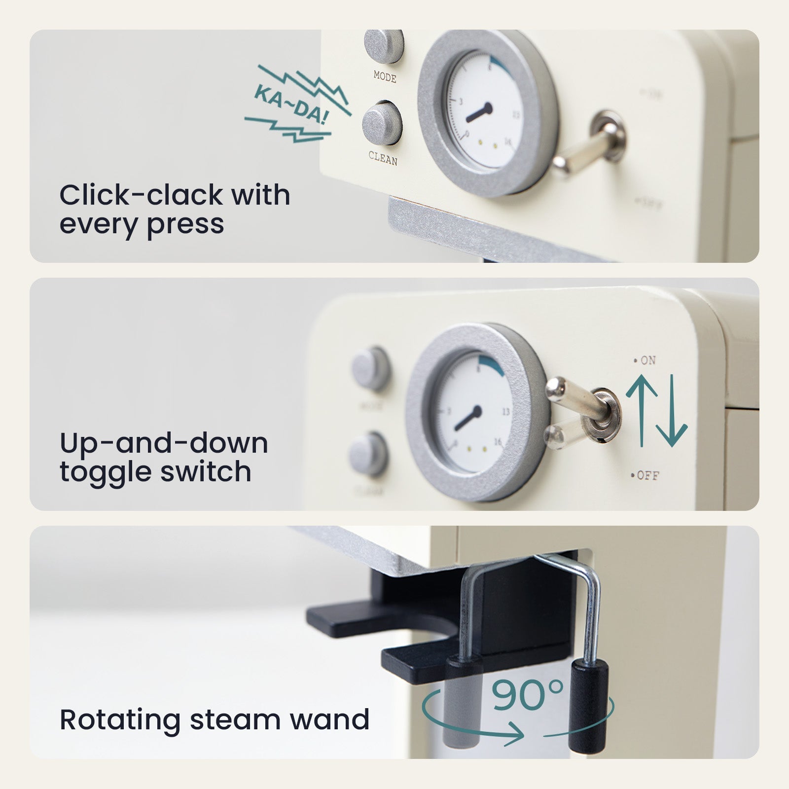 The Wooden Café Set brings the magic of coffee-making into little hands. With a clickable brew button, a smooth-rotating steam wand, and a detailed acrylic pressure gauge, every feature is designed for authenticity. From brewing to frothing and serving, each step inspires wonder, creativity, and joyful play.