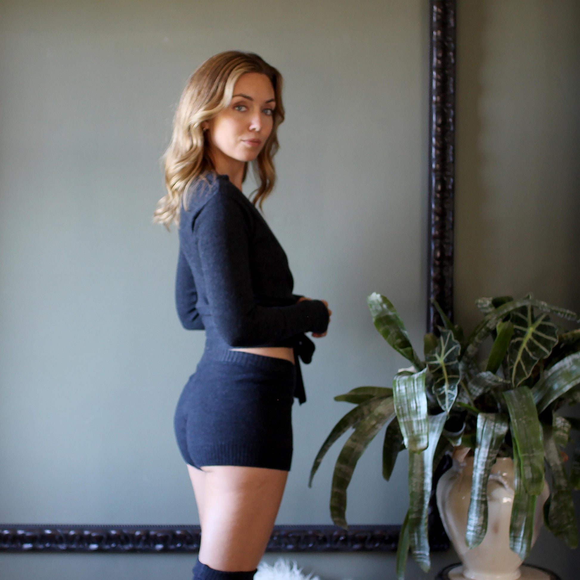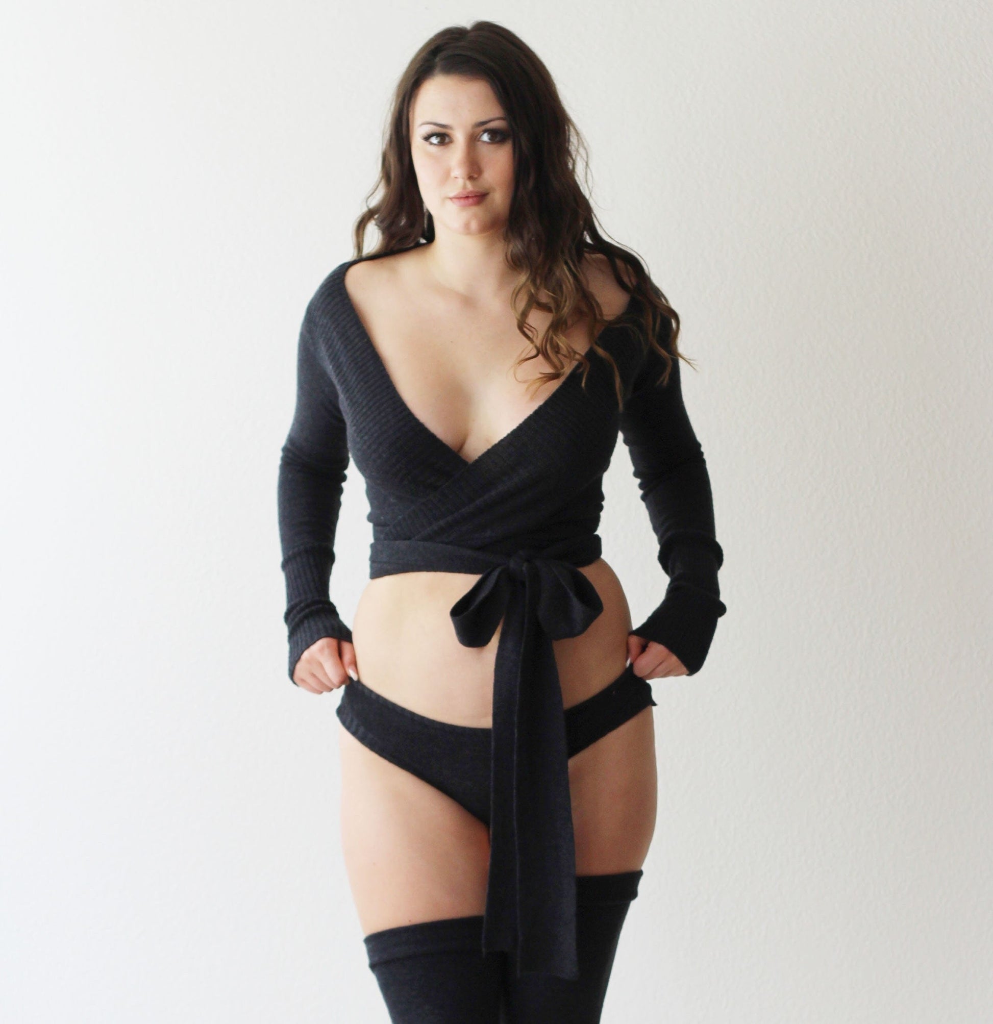 Features long double knit ties, off the shoulder ribbed neckline and long fitted sleeves.