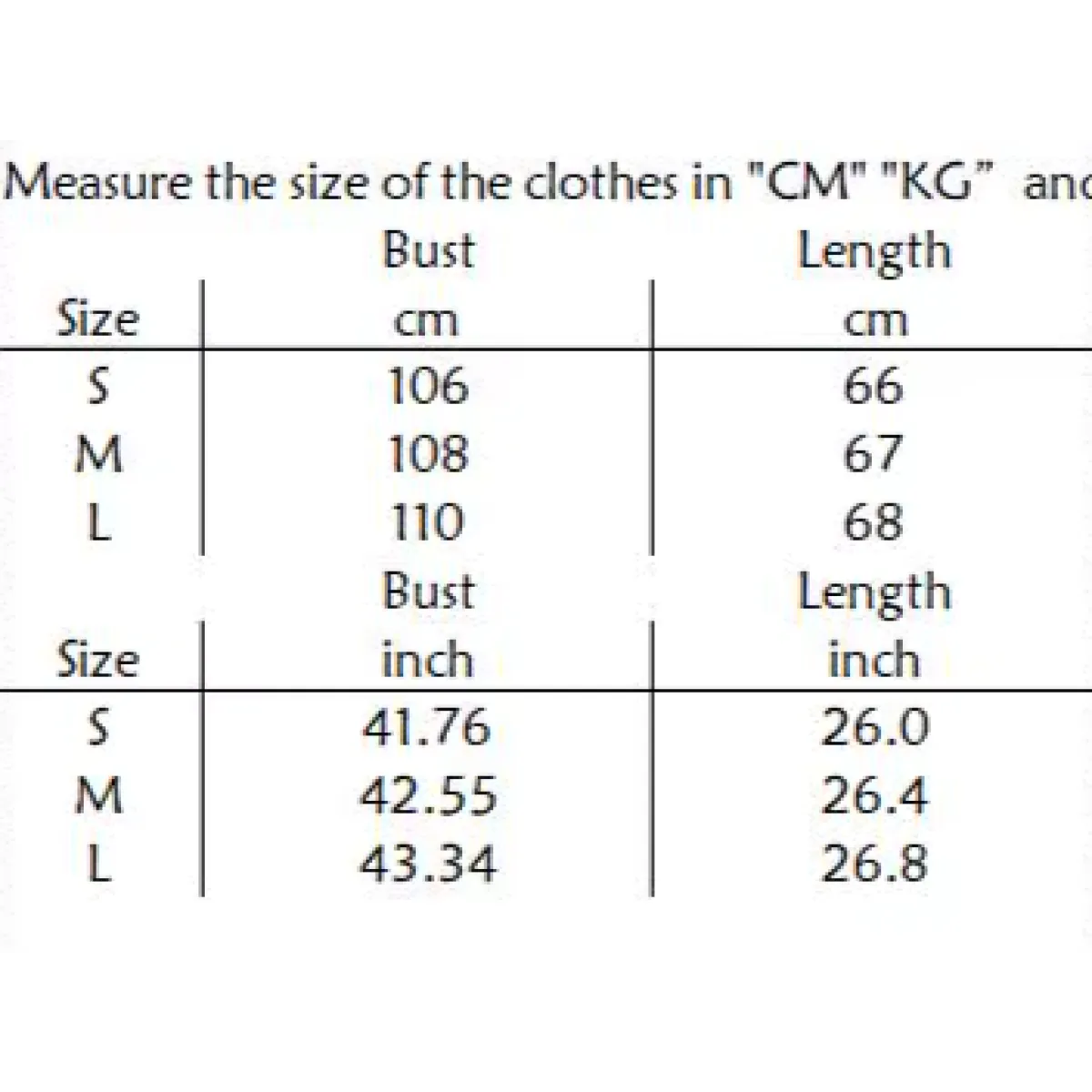 | Size | Bust (cm) | Length (cm) | Bust (in) | Length (in) |