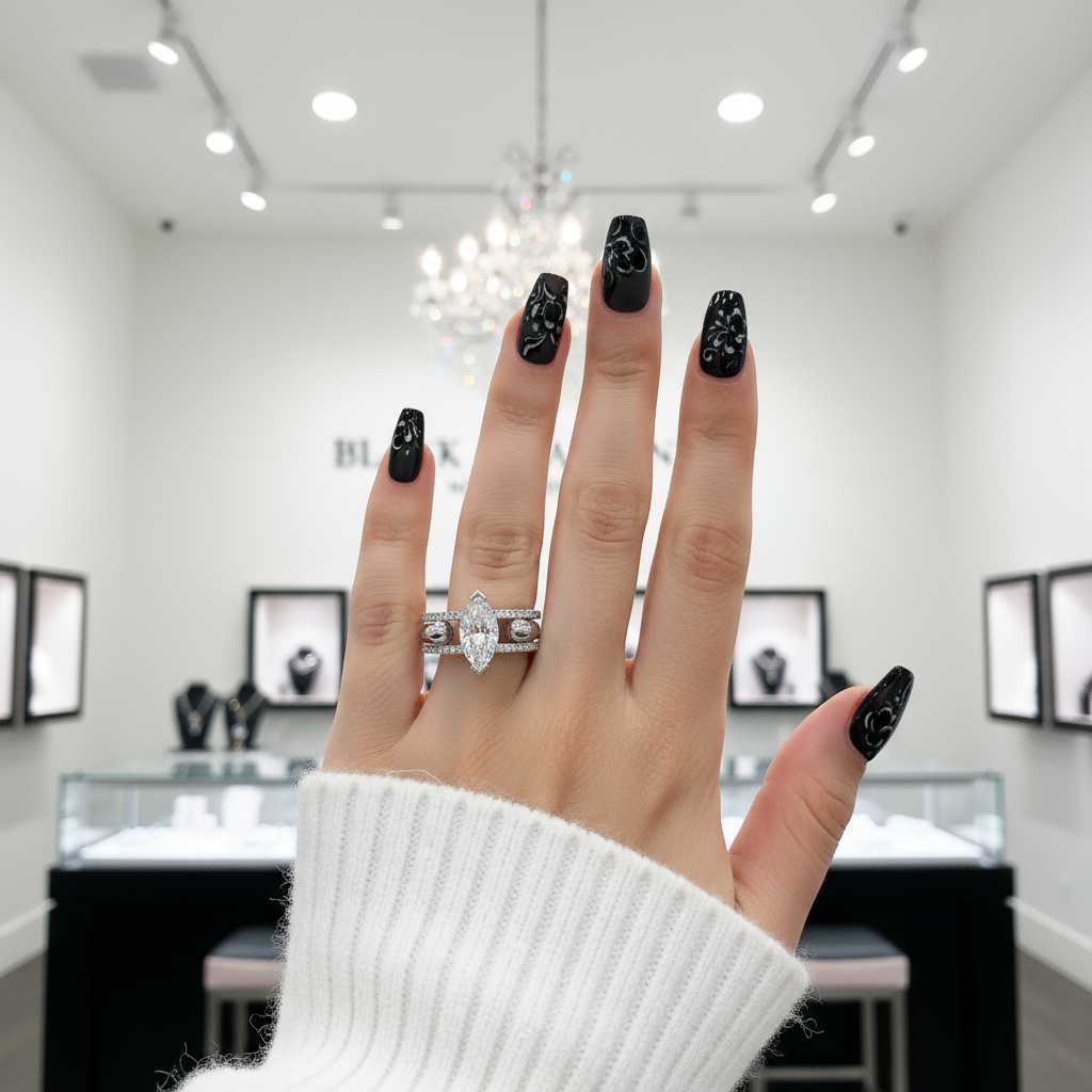 The You & Me Gothic Wedding Rings feature a stunning marquise cut black diamond set in elegant 14k rose gold, surrounded by dark romantic detailing that captures the essence of everlasting love. Perfect for alternative brides and gothic romance lovers, this bridal set symbolizes unity, devotion, and passion that never fades.